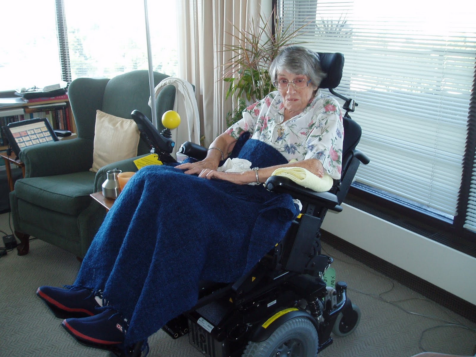After a timid start there's been no holding Wendy back these past few days as she gets more accustomed to driving her power wheel chair. All the family felt frustrated when we had such perfect weather last weekend but we simply couldn't persuade her to go outside. Early in the week, however, Rebecca and Richard backed me in tempting her to venture out the back door in the corridor between our tower block and the garage, then the next day Courtney Henderson, who fitted her for the chair and made last-minute fine-tuning adjustments, persuaded her to go out the ramp from the garage to the street. Once she has got used to driving out of doors there will be no holding her. But she loves the chair most of all because she can tilt it to the position that she finds the most comfortable -- as you can see in the photos in the post before this one. Now she is spending most of her waking hours in it.